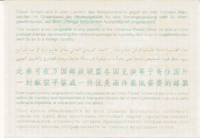 Allerdings haben viele Länder, um diesem langweiligen Einheitsbrei der UPU zu entgehen, IAS mit vorgedrucktem Verkaufspreis in Landeswährung bestellt oder die Scheine mit Handstempeln kenntlich gemacht.