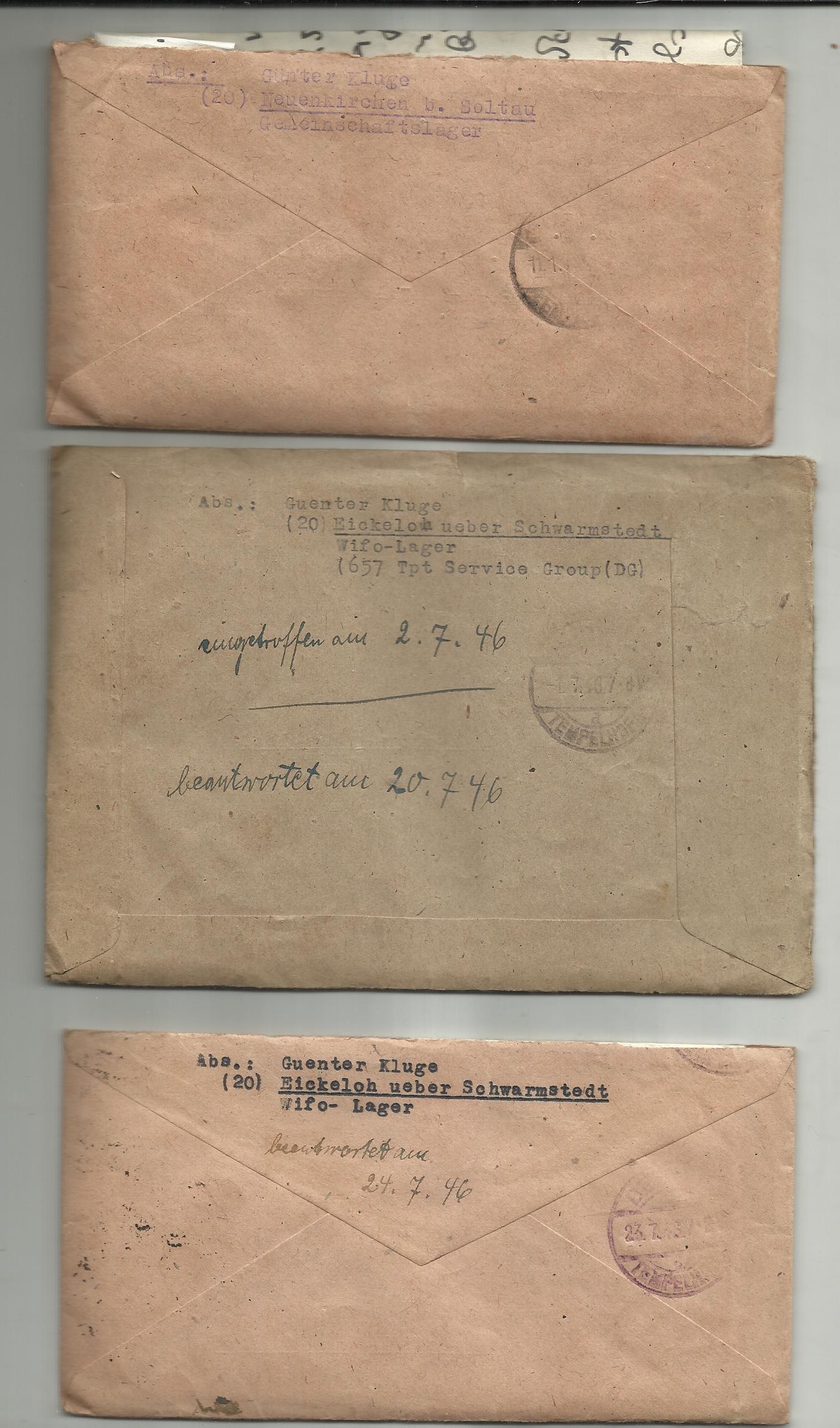 Es handelt sich dabei um mehrere eingeschriebene Briefe aus der Britischen Besatzungszone in den Amerikanischen Sektor von Berlin aus dem Jahre 1946. Unter philatelistischen Gesichtspunkten ist die Verwendung handgestempelter R-Zettel markant. Mehrere Briefe werden durch Ortsstempel "20 Eickeloh über Schwarmstedt" verziert. Der erste Brief (Marke entfernt oder Stummer Stempel) stammt aus dem "Sammellager" Neuenkirchen bei Soltau. Die anderen aus einem "Wifo"-Lager Eickeloh der 657 Tpt Service Group. Die "Wissenschaftliche Forschungsgesellschaft" Wifo war eine der Deutschen Wehrmacht unterstellte Organisation zum Aufbau und Betrieb grosser kriegswichtiger Treibstofflager. Wie es aussieht, wurde das zentrale Lager Eickeloh einige Zeit durch die britische Besatzungsmacht weiterbetrieben. Aus den Briefen geht hervor, dass die Wehrmachtseinheit, der der Briefeschreiber angehört hatte, in ihrem Bestand noch bis 1946 faktisch weitergeführt und, nachdem die für Anfang 1946 avisieren "Entlassungen" neuen Diennstverpflichtungen gewichen waren, als kasernierte Transportation Service Group weiterhin für die Briten Dienst schob. Offensichtlich wurde den weiterhin unter Kommandostruktur stehenden Angehörigen der Einheit aber der Status von Kriegsgefangenen vorenthalten (keine portofreie Kriegsgefangenenpost), auch beklagt sich der Schreiber über die extrem schlechte Verpflegungssituation in dem Lager und verweist auf die Postzensur. Andererseits durfte sich der Lagerinsasse dienstlich auch zivil außerhalb des Lagers bewegen und sich zahnärzlich versorgen lassen (wohl plötzlicher Zahnausfall durch Unterernährung). Erst mit der Einführung der Schwerstarbeiterzulage verbesserte sich die Verpflegungssituation. Briefkontakte an Angehörige in die "Russische Zone" waren verboten, was nach humanitärem Kriegrecht nicht zulässig gewesen wäre. Ich bin zum ersten Mal auf derartige Lagerpost gestossen und wäre dankbar für weitere historische Erklärungen.