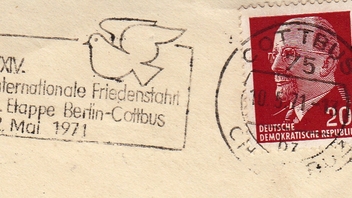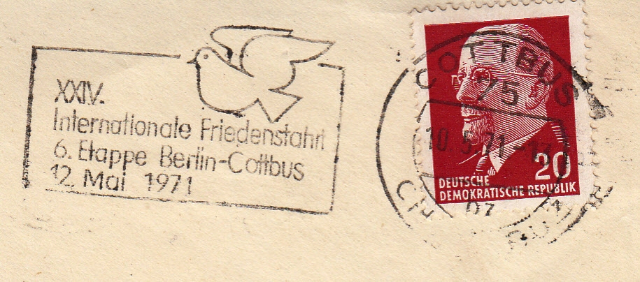 Zur XXiV. Friedensfahrt, Cottbus war am 12. Mai Zielort der 6. Etappe, gab es ebenfalls einen Stempeleinsatz.