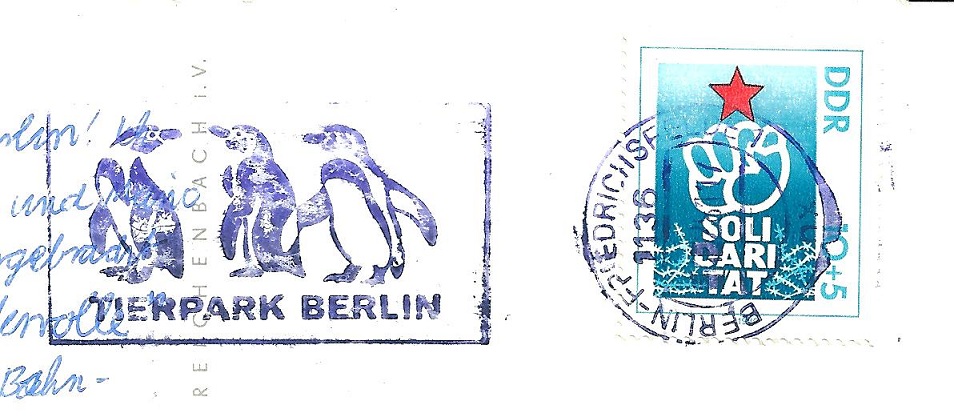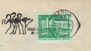Der Stempel von Berlin BPA sieht mir nach einer deutschen Stempelmaschine aus (die Werbeeinätze in der DDR waren bis zuletzt alle quer-rechteckig, quadratische kamen m. W. erst nach der Wende bzw. Währungsunion dort in Gebrauch); es wäre allerdings interessant zu wissen, wie viele verschiedene Werbeeinsätze es für den Berliner Tierpark gab ... da kommt bestimmt eine kleine Menagerie zusammen ...