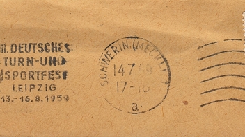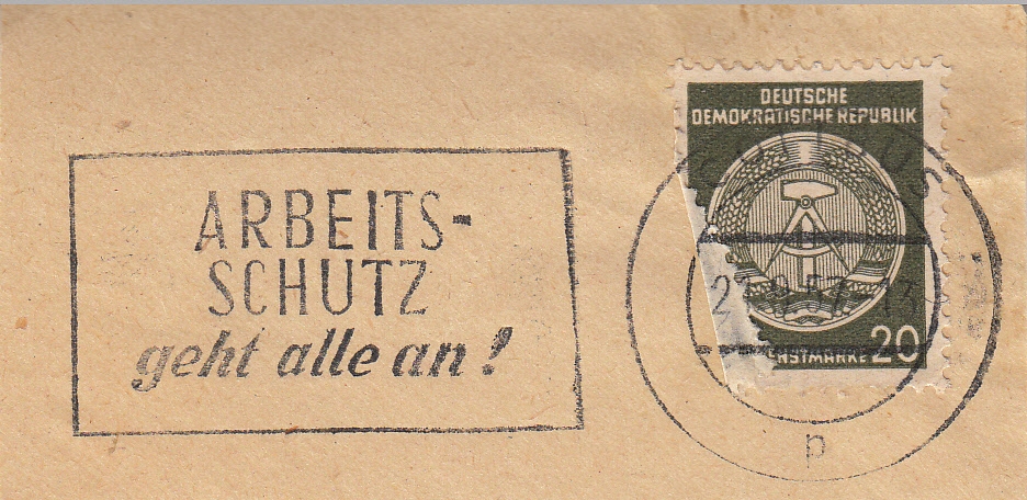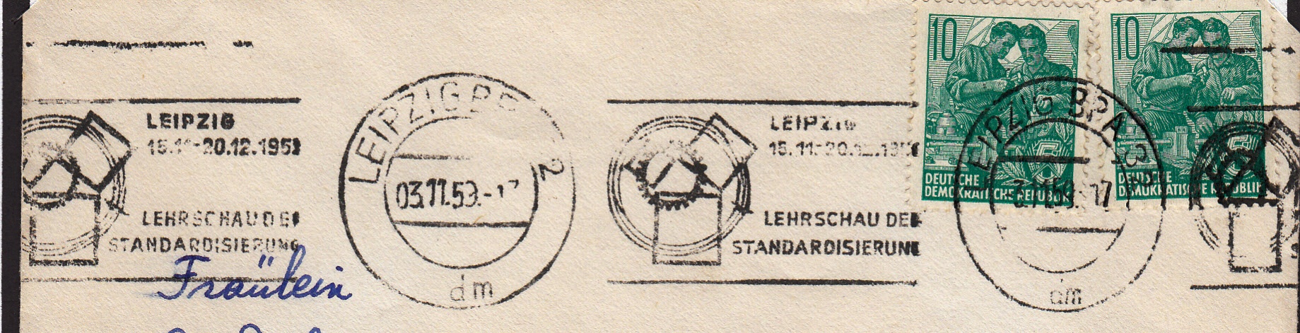 Fahnenstempel mit Einkreis-Stempel in der Mitte sowie Werbeeinsatz links und Entwerter rechts sind mir aus Schwerin bekannt. Hier zwei Beispiele aus dem Jahr 1958.