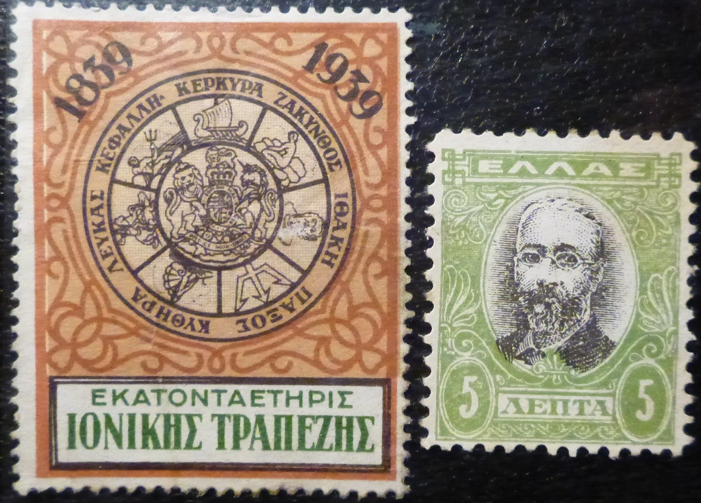 die linke "Marke" hat die Inschrift "100 Jahre Ionische Bank. Also eher eine Reklamemarke. Rechts habe ich wie die anderen auch "nichts gefunden" im Michel .. würde aber von Druck-Qualität und Wertangabe (5 Lepta, also 5 Hunderstel einer Drachme) auf eine Steuermarke tippen. Vielleicht gab es eine Stempelsteuer?Hallo steppenwolf,