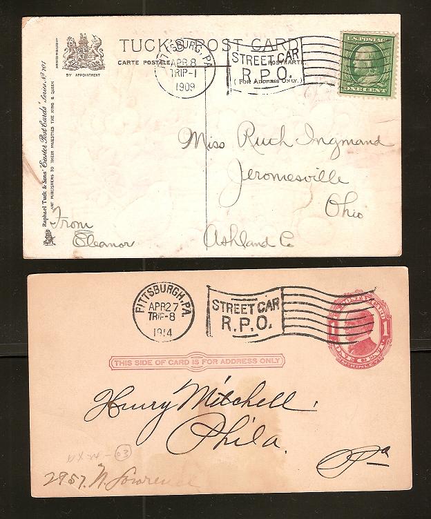 Zweimal Strassenbahnpost_Stempel aus Pittsburgh. Die sind, wie gesagt, die einziger dieser Stempel, die tatsächlich "Street Car" sagen. Man beachte die koorigierte Schreibweise von Pittsburgh in dem zweiten Stempel.