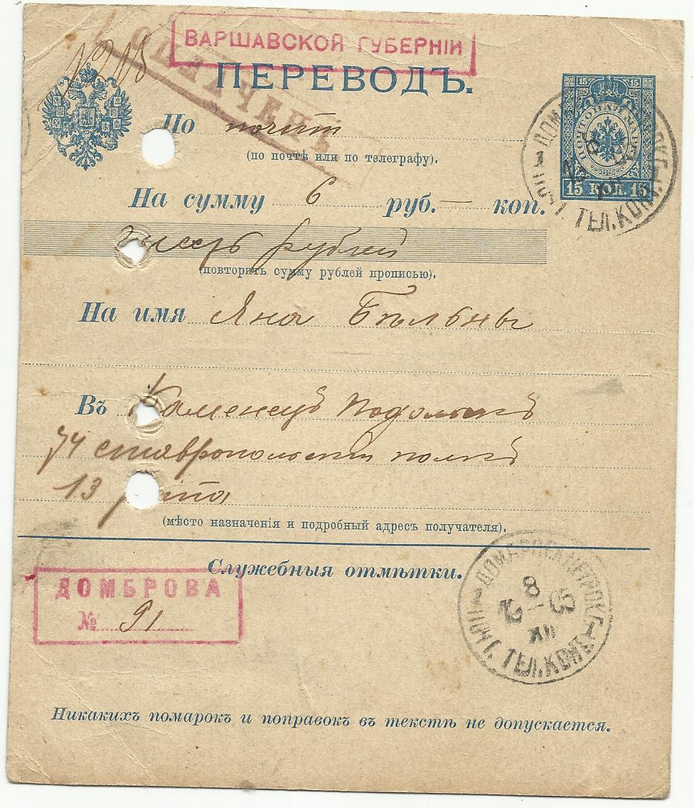 Frankiert und abgeschickt wurde der Schein in Belbek, wohl einem Ort in der Nähe von Sewastopol, wofür ein numerierter Wertbriefzettel und mehrfache Abstempelungen sprechen. Adressat ist ein Mann, wohl mit dem Namen Hermann Press aus Warschau (damals Russisch Polen). Es könnte eventuell aber auch "Deutsche Presse" Auf der Rückseite befindet sich ein Ankunftsstempel aus Warschau vom 3012.1909 und die Unterschrift des Empfängers, wohl ein Herr Müller.