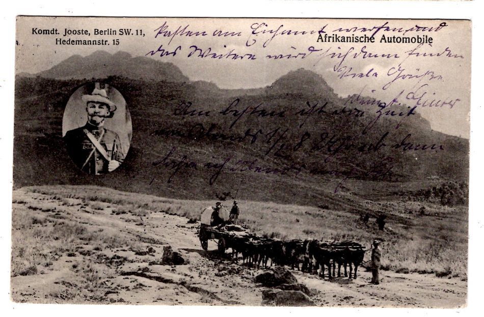 Die Ansichtskarte handelt von der Buren-Versammlung auf der Grotenburg (Bergbezeichnung) bei Detmold, vermutlich 1907, rechts das Hermann-Denkmal, links ein Buren-Kommandant. Unten steht noch geschrieben: Der Betrag umstehenden Werthzeichens fliesst ungekürzt in den Burenfonds des Alldeutschen Verbandes.