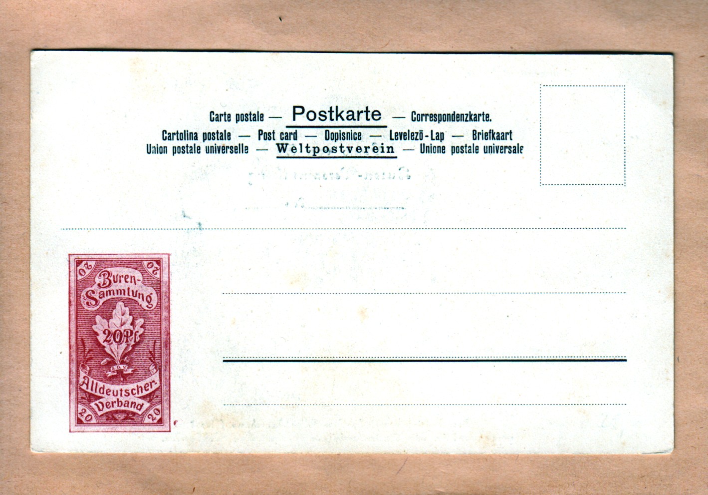 Ganzsachen weisen oben rechts normalerweise ein in den Karton eingedrucktes Wertzeichen auf. Heute habe ich diese seltsame "Privat-Vignetten-Ganzsache" bekommen. Unten rechts ist ein Werteindruck einer Spendenmarke zu sehen, 20 Pfennige zugunsten der Buren-Sammlung Alldeutscher Verband. Oben rechts leider kein offizieller Werteindruck, sonst wäre die Karte noch viel interessanter! ![]()