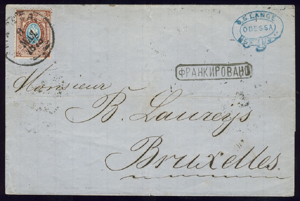Nr. 21x von ODESSA - 9. Mai 1875 (Julianischer Kalender) nach Brüssel. Das 10-Kopeken-Porto war der ab 1. Januar 1872 nach einer Portosenkung gültige Tarif. Der Nebenstempel "FRANKIROWANO" zeigt an, das der Brief voll frankiert ist. Der Brief erreichte Brüssel dann am 25. Mai (Gregorianischer Kalender) und war somit gerade einmal 4 Tage unterwegs. Rückseitig mehrere Transitstempel mit u.a. Bahnpoststepel der Strecke Odessa - Kasatin.