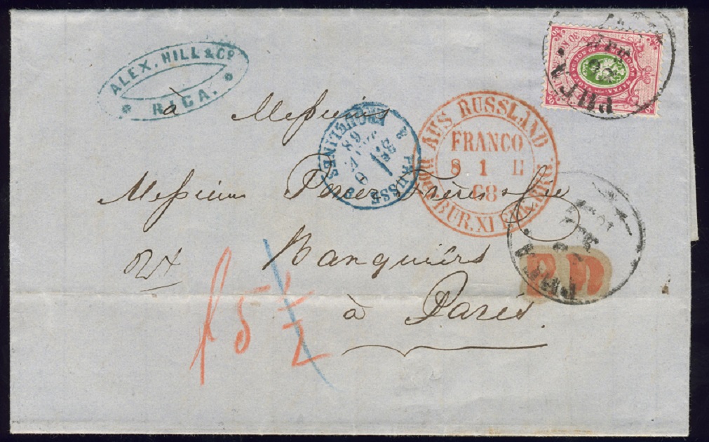 Die Destination Frankreich war eine der häufigsten. Dieser Brief mit Nr. 17 lief von RIGA - 28. Dez. 1867 nach Paris. Der Brief ist um 2 Kopeken überfrankiert, da 28 Kopeken für die erste Gewichtsstufe ausgereicht hätten.