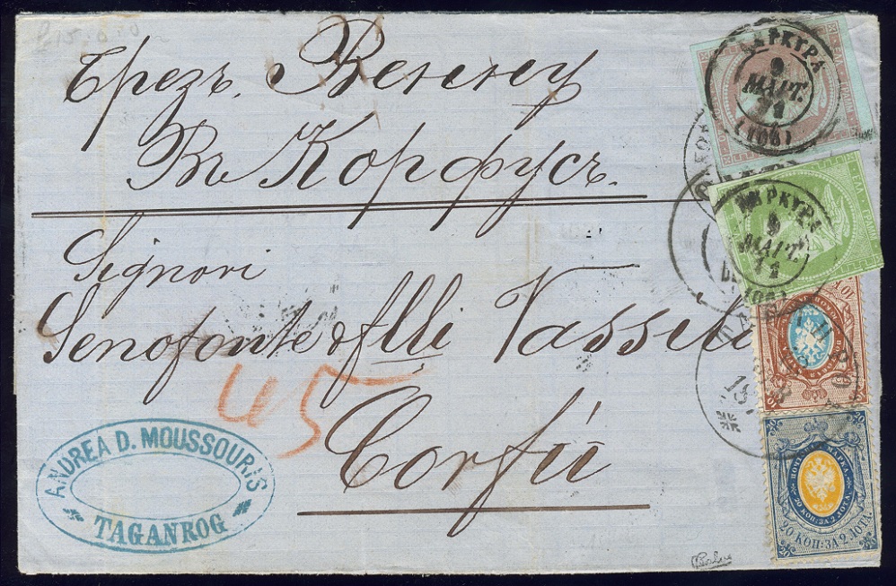Hier habe ich einen Leckerbissen. Nr. 3 + Nr. 21x als 30-Kopeken-Frankatur von TAGANROG nach Corfu. Der Brief lief via Odessa über das Schwarze Meer vermutlich bis Konstantinopel und wurde dann per Schiff weiterbefördert. Auf Grund fehlender Stempel kann der Weg zwar nicht nachgewiesen werden, es ist jedoch der übliche Weg. Zudem betrug das Porto bis Konstantinopel 30 Kopeken. Ab dort wurde der Brief mit 45 Lepta für den Schiffsweg nachtaxiert und mit griechischen Marken verklebt.