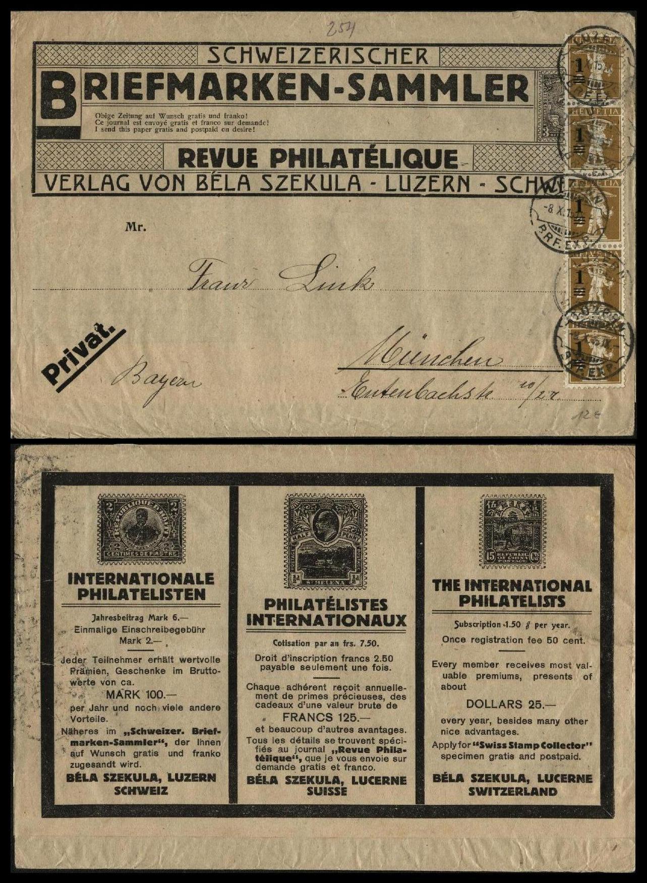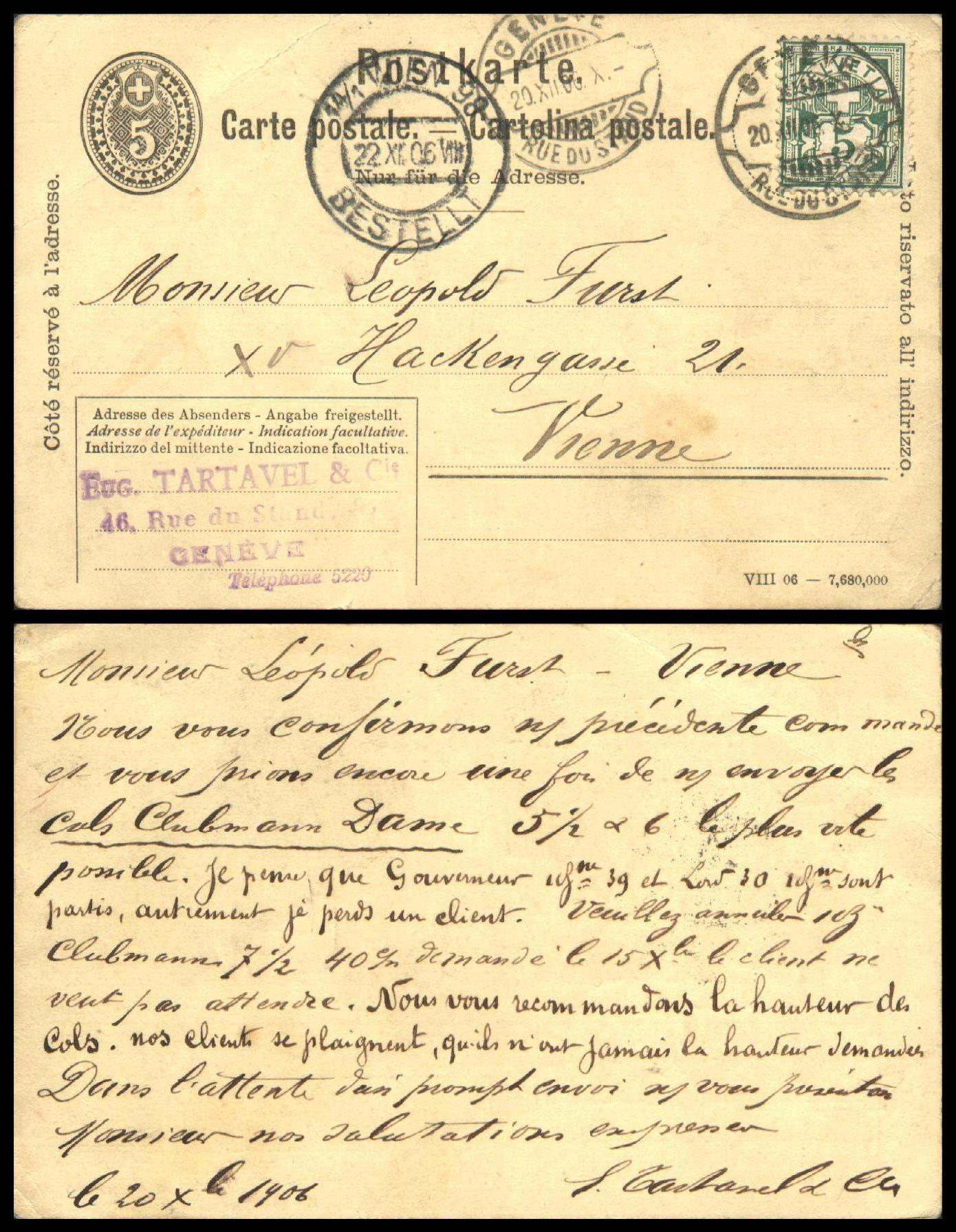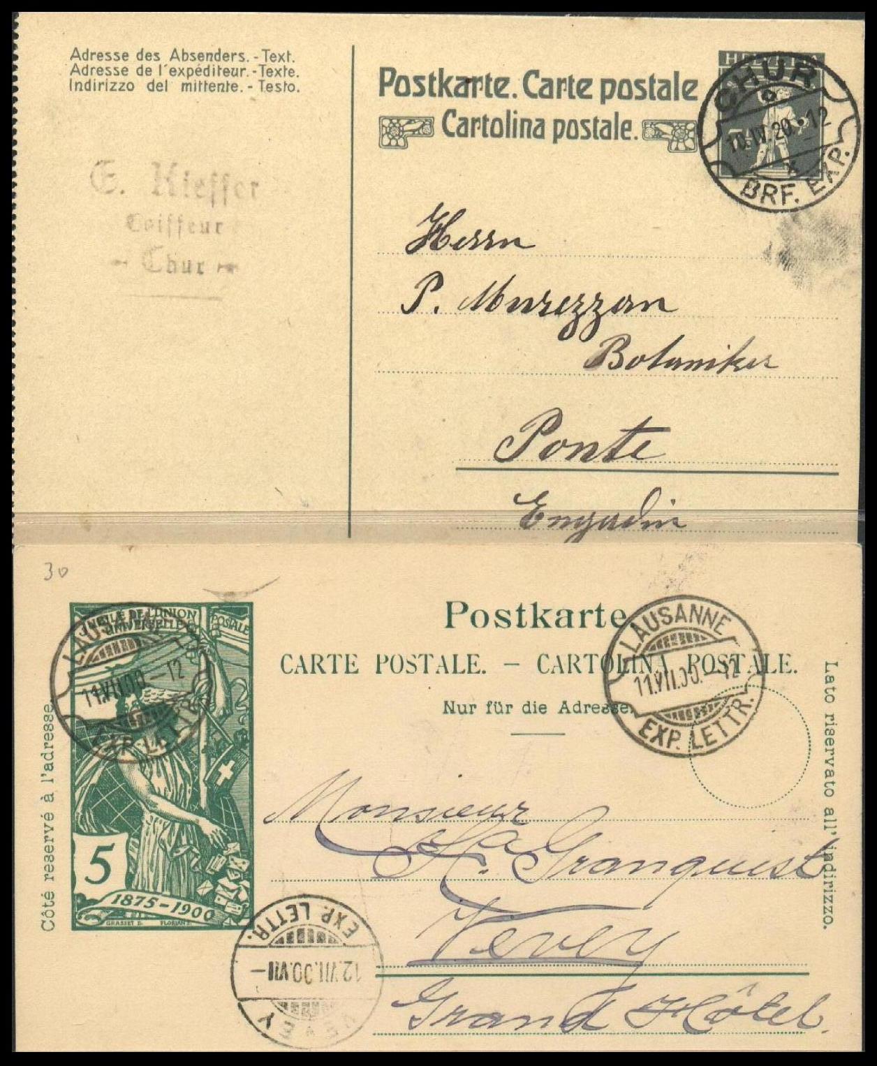 Ein interessantes Sammelgebiet für die Schweiz-Sammler sind die so genannten Rasierklingen-Stempel, die optisch schön ins Auge fallen. Gerade ist mir der erste seiner Art in die Hände gefallen, ein Ankunftsstempel von Lausanne mit Inschrift „EXP.LETTR.“ Die Ansichtskarte ging am selben Tag mit einem anderen Stempel Lausanne wieder heraus, da der Empfänger inzwischen eine andere Adresse hatte.