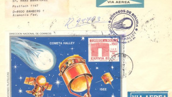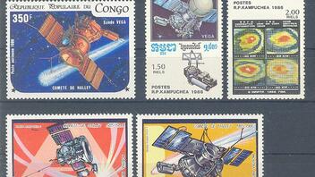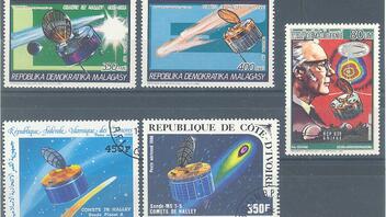 3. Die Sonden Sakigake und Suisei auf Marken von Madagakar (MiNr.1061-62). Die Sonde Suisei (Planet A) auf Marke von den Komoren (MiNr.776). Die Sonde Sakigake (MS-T5) auf Marke von der Elfenbeinküste (MiNr.891). Die Sonde Suisei (Planet A) auf Marke von Mauretanien (MiNr.892).
