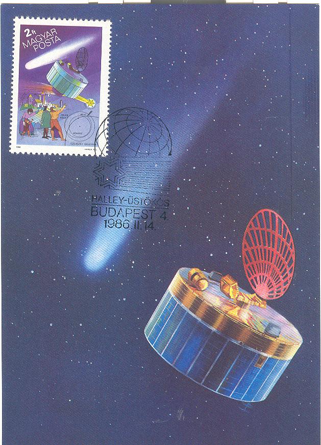 3. Exemplarisch vier Maxikarten aus Ungarn (das Set besteht aus 6 Karten) mit einer Auflage von je 2000 Stück. Abgebildet sind die beiden Vega Sonden, die Sonde Giotto und die Sonde ICE. Beklebt sind die Karten mit Marken aus der Serie zum Halleyschen Komet (MiNr. 3805-11). Auch ein Sonderstempel wurde wieder abgeschlagen.