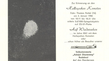 es ist Zeit mal wieder was zum Thema Halleyscher Komet vorzustellen. Heute zeige ich etwas was ich kürzlich aus der elektronischen Bucht gezogen habe. Ein Einschreiben aus der DDR zum Thema Halleyscher Komet. Mit viel Liebe ist hier ein schöner Beleg zum Thema entstanden. Im Mittelpunkt steht ein auf der Volkssternwarte „Adolph Diesterweg“ in Radebeul aufgenommenes Bild des Halleyschen Kometen (Schwarz Weiß Foto) auf der Rückseite der Karte. Neben genauen Details zur Bildentstehung ist die Karte natürlich auch Eigenwerbung für die Sternwarte und dient auch noch als Eintrittskarte für die Beobachtung des Halleyschen Kometen im Jahre 2061/62. Das finde ich mal originell. Auch ein etwas schwach auf der Vorderseite abgeschlagener Handstempel „Augenzeuge des Kometen HALLEY“ ist noch dabei. Echt gelungen. Leider ist der Tagesstempel Radebeul nicht gut lesbar aber ansonsten finde ich das Stück schon sehr hübsch und werde es in meine Sammlung aufnehmen. Frankiert mit 60 Pfennig wurde das Einschreiben nach Pirna befördert. Ein R-Zettel (8122 Radebeul 1) befindet sich auch noch auf der Karte. Die Sondermarke von Leonhard Euler hat auch noch einen gewissen Themenbezug denn der Wissenschaftler hat sich auch auf dem Gebiet der Optik verdient gemacht.
