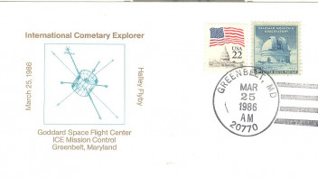 2. Beleg zur größten Annäherung der Sonde Suisei an den Kometen Halley (Flyby 08.03.1986) vom Usuda Space Center (Stempel)