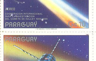 3. Die Sonden Sakigake und Suisei auf Marken von Madagakar (MiNr.1061-62). Die Sonde Suisei (Planet A) auf Marke von den Komoren (MiNr.776). Die Sonde Sakigake (MS-T5) auf Marke von der Elfenbeinküste (MiNr.891). Die Sonde Suisei (Planet A) auf Marke von Mauretanien (MiNr.892).