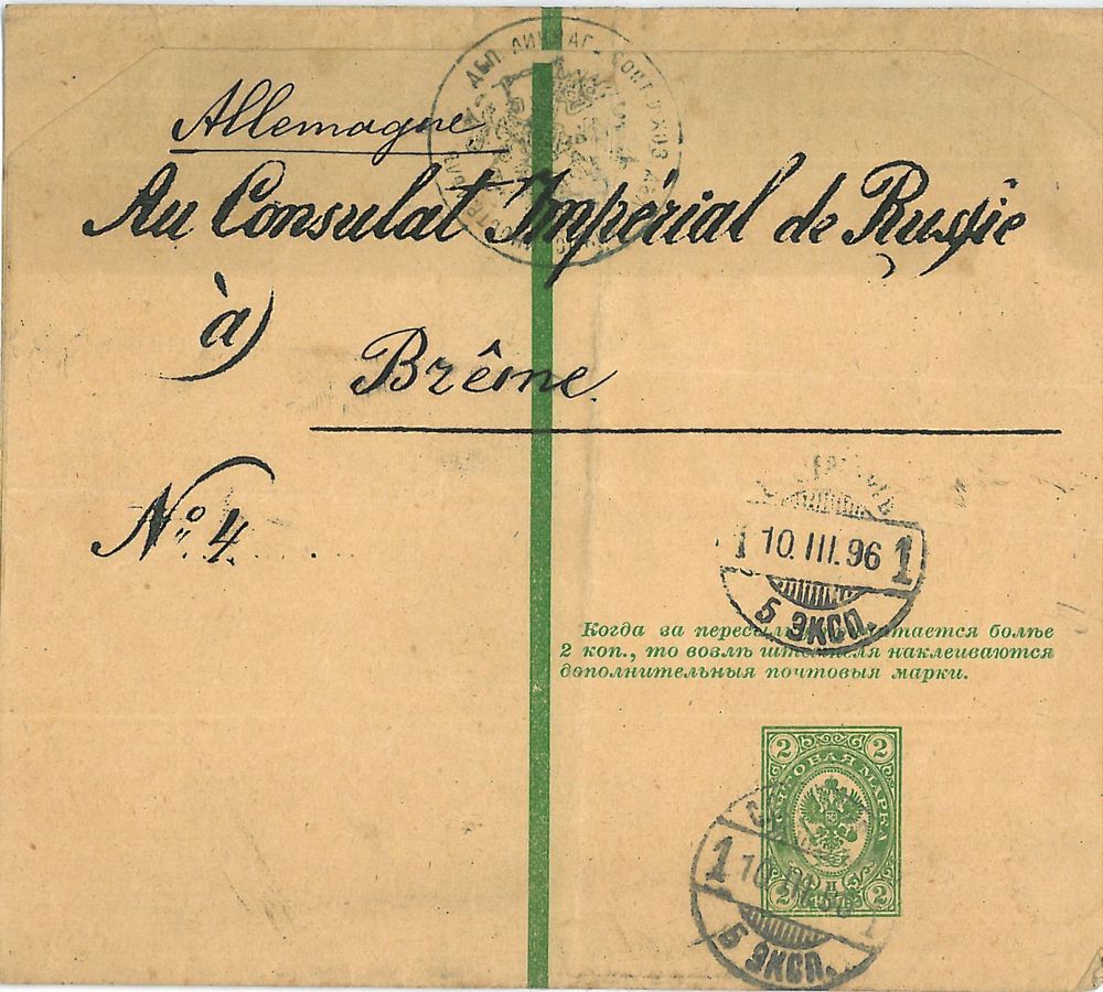 Heute möchte ich das schmale Format des Streifbands, Ausgabe 1891 zeigen. Es wurde 1896 für eine Sendung vom Departement für Personal und Verwaltung des Außenministeriums (Rundstempel oben mittig) an das Russische Konsulat in Bremen verwendet.