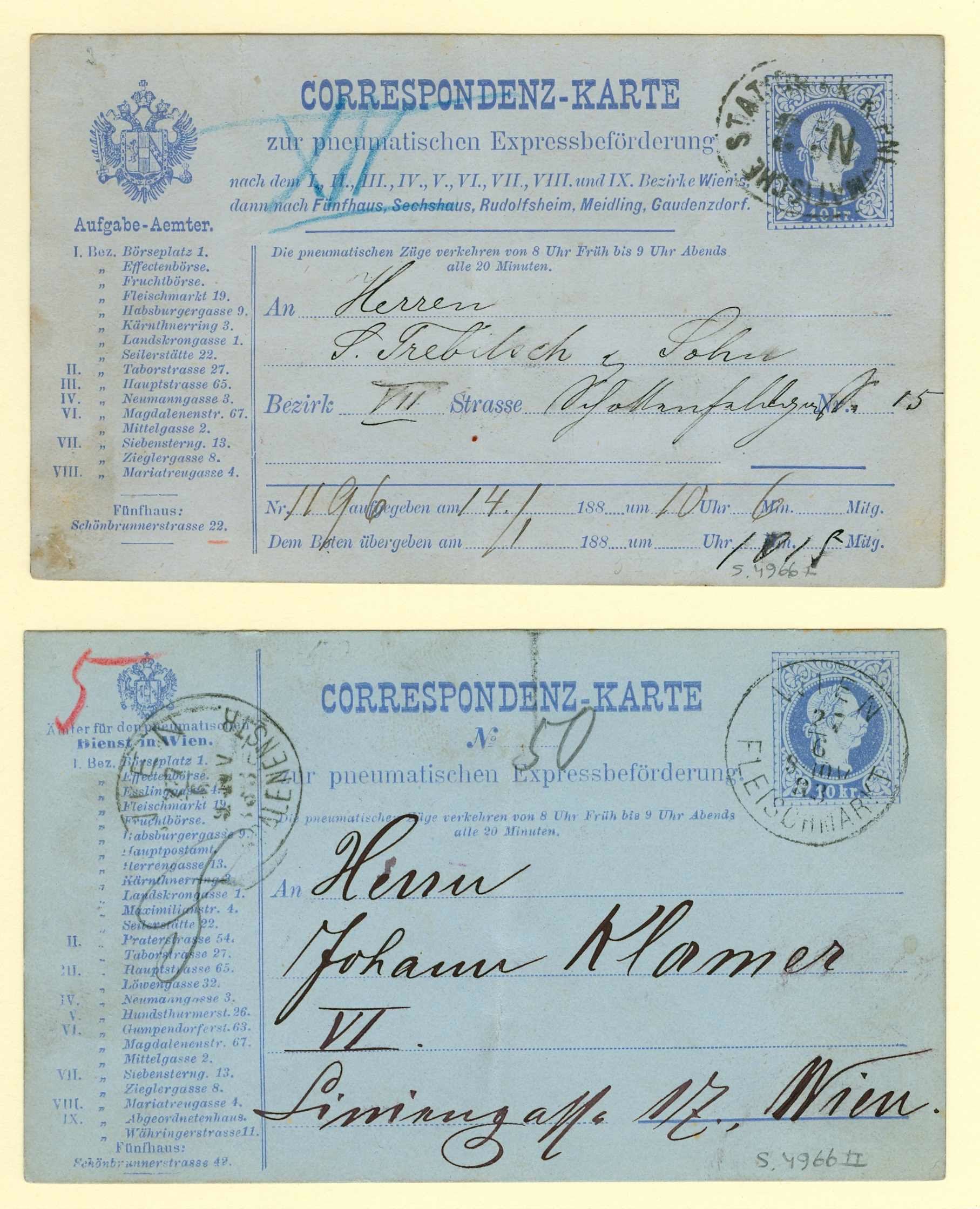 Ich habe diese 2 Rohrpostkarten aus 1881 und 1883 in meine Sammlung.