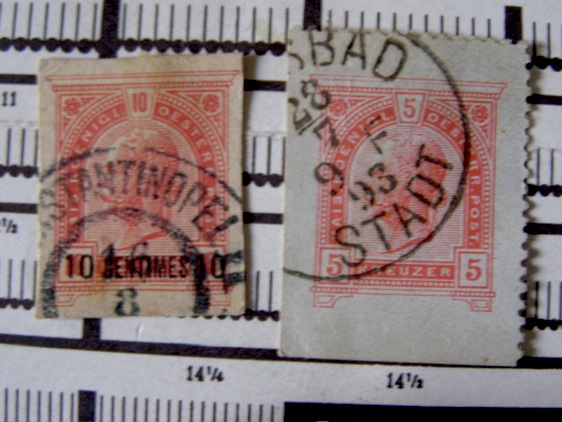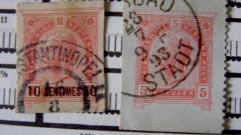 Die linke, 10 Centimes auf zehn Heller scheint für Kreta gedruckt, aber in (Kon?)stantinopel auf den Weg gegangen zu sein.