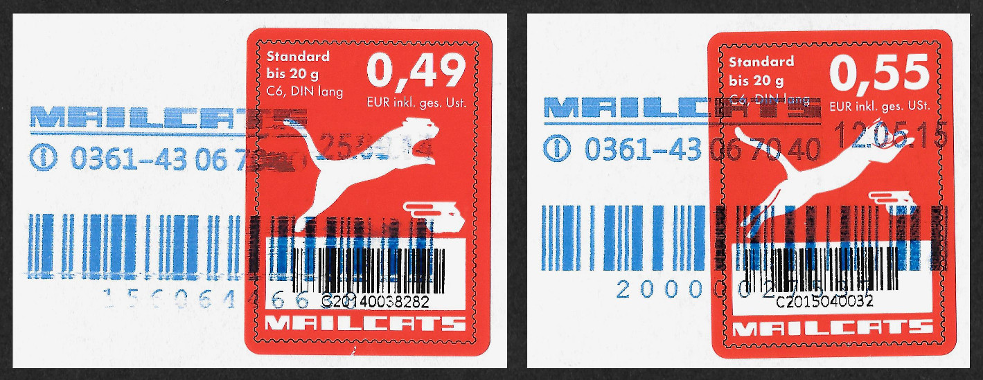 Die herausgegeben Marken sind größtenteils selbstklebend mit Wellenschnitt, sie lassen sich wie bei den meisten privaten Postdienstleistern nicht mit Wasser ablösen. Bei PostModern werden einige verschiedene Stempel verwendet (Tintenstrahldrucker?), die Abbildungsqualität ist meist gut. Daher versuche ich, entweder komplette Belege oder Abschnitte mit vollständigen Stempeln zu bekommen.