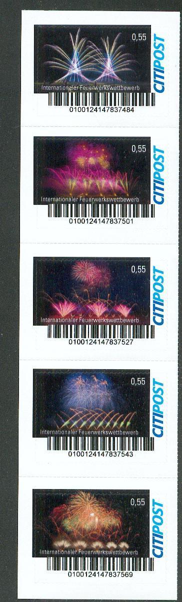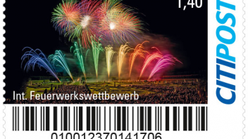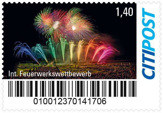 Eine farbenprächtige selbstklebende Briefmarke "Internationaler Feuerwerks-Wettbewerb" zu 1,40 EUR gibt es in einem Markenheft à 10 Marken bei der Citipost: