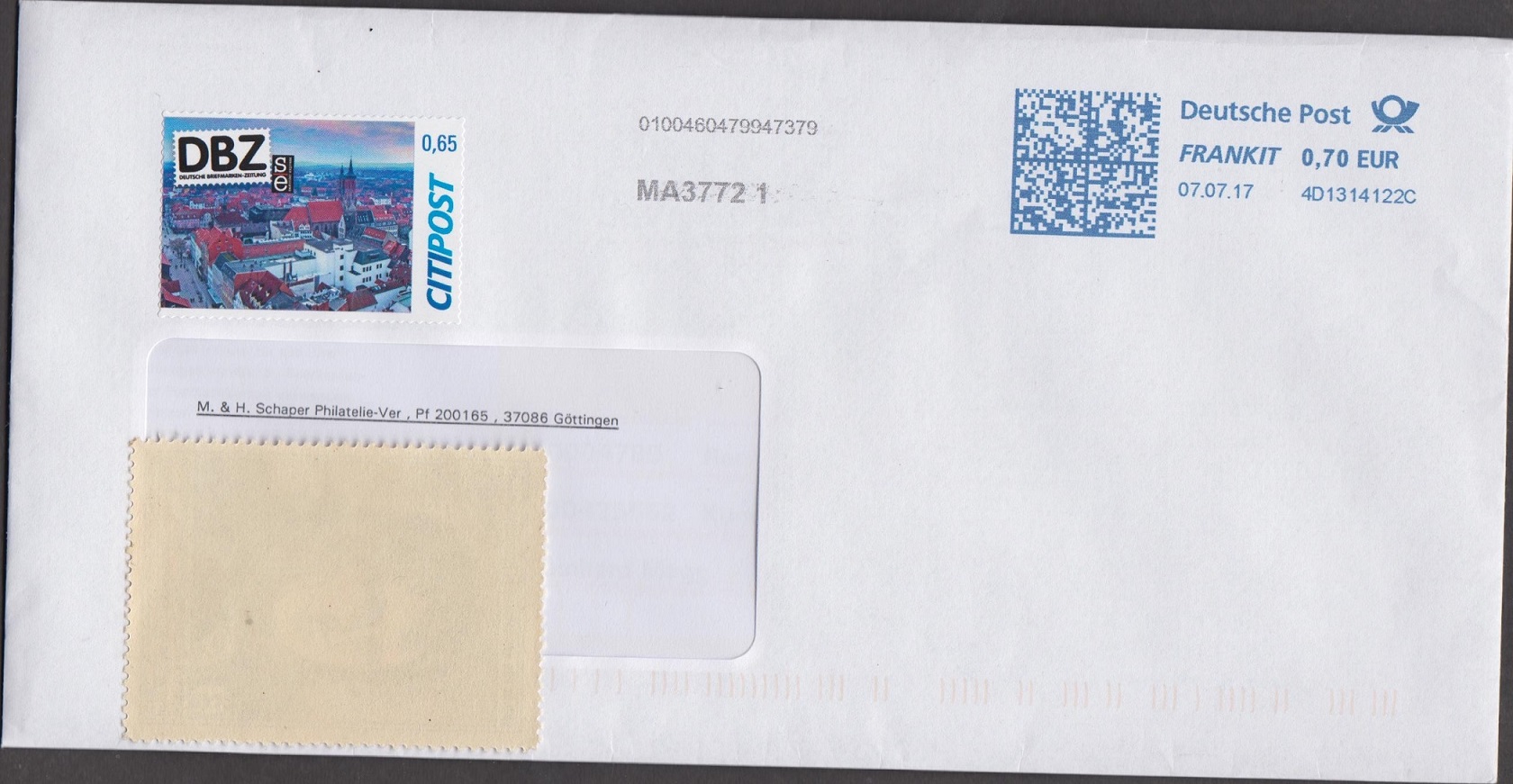 Heute erhielt ich Post von der DBZ, wohl die Abo-Rechnung, mit der 2. mir bekannten individuellen Marke von der Citipost. Wie die erste Marke (vorgestellt am 8.7.2016!) ganz am linken Rand, und wieder nicht gestempelt, nur rechts der Freistempel FRANKIT der Post.