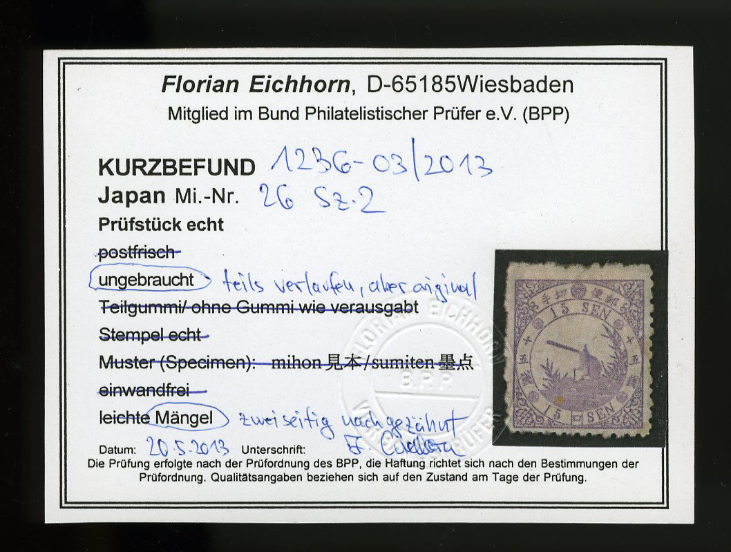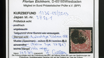 habe eine alte Japan-Briefmarke, MiNr. 27 mit Kontrollzeichen 2, auf Echtheit prüfen lassen und ein positives Ergebnis erhalten, allerdings mit Nachzähnungen (s. Befund). Ich möchte die Marke gerne verkaufen. Wenn ich das richtig sehe, beträgt der Michel-Wert (2011) für die Marke 2200 Euro.