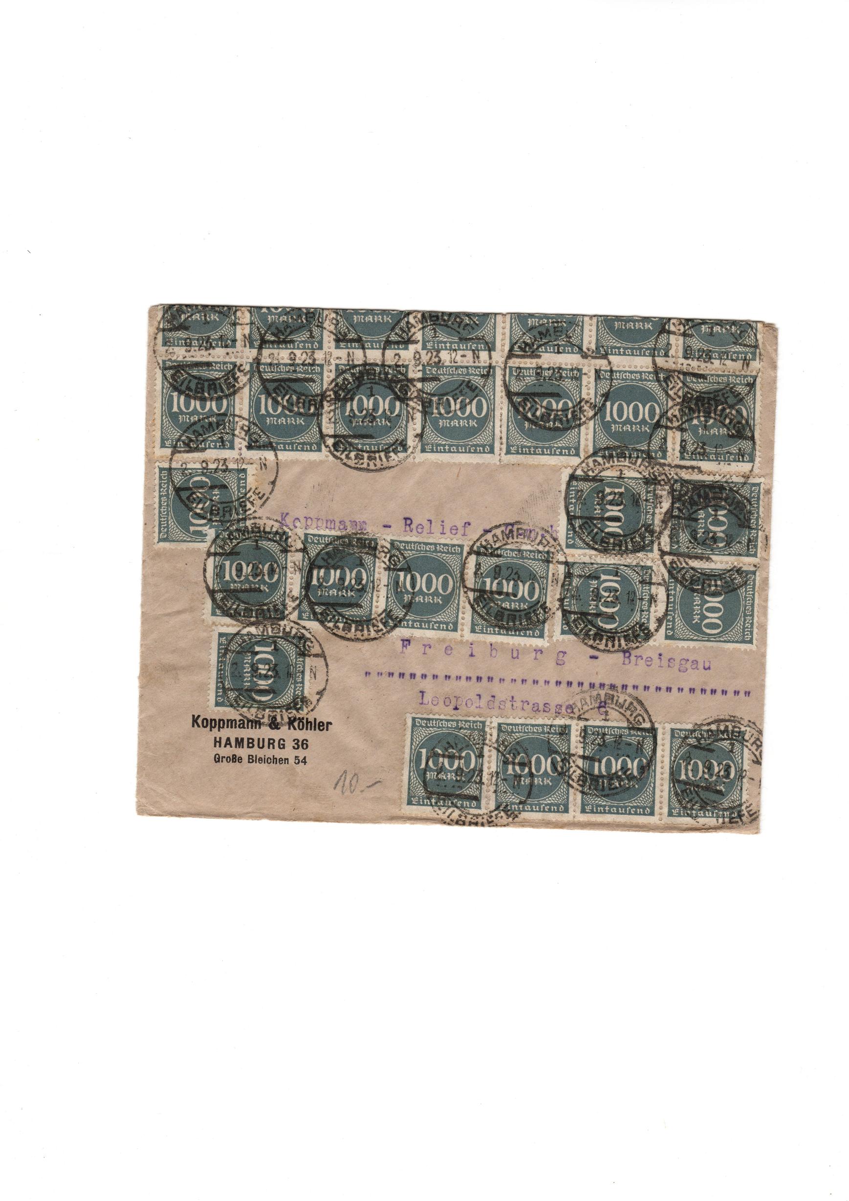 Der Brief ist mit 20 Marken Michel DR 253 a 2000,- M frankiert.
