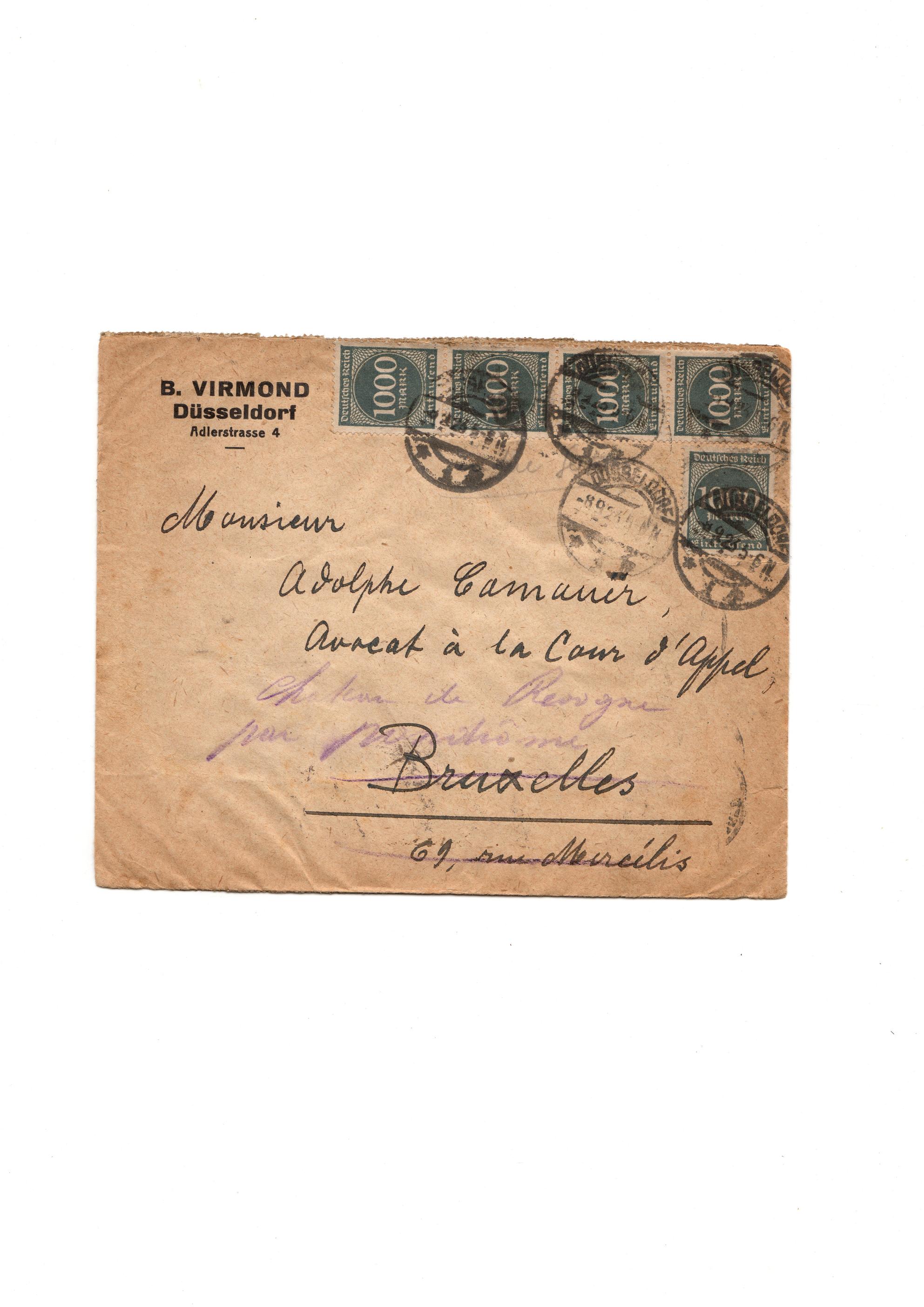 Der Brief ging am 8. 9. 23 von Düsseldorf nach Brüssel und währe eigentlich mit 25000,- überfrankiert wenn nicht noch eine zusatzleistung dazu gekommen ist die sich mir aber anhand des Briefes nicht erschließt!