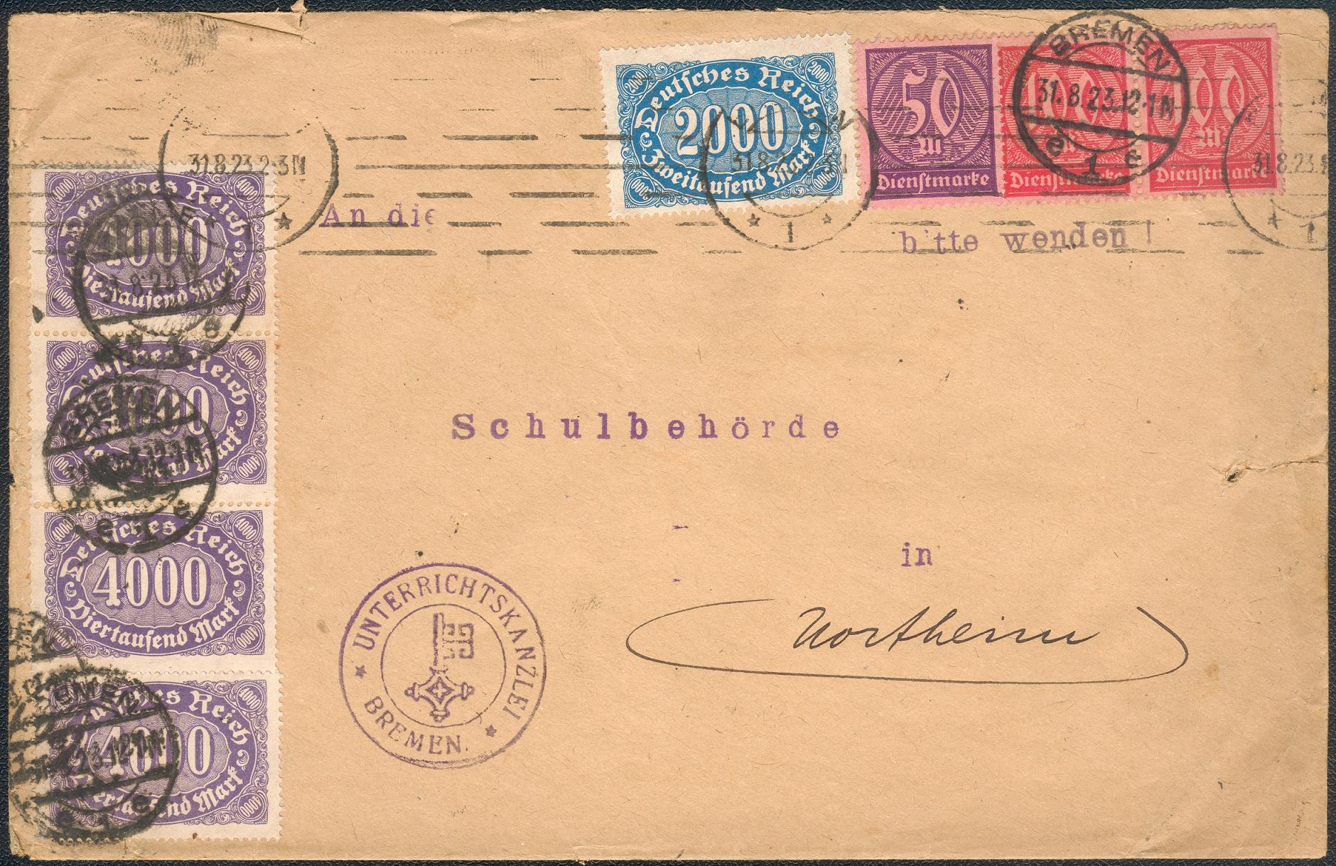 Also währen der großen Inflation in Deutschland 1914 bis November 1923 war die Geldentwertung so rasant dass man mit dem Druck der neuen Briefmarken in der Schlussfase nicht mehr nachkam. Vor allem zum Ende so ab Dezember 1922 würde das Geld fast täglich weniger wert.