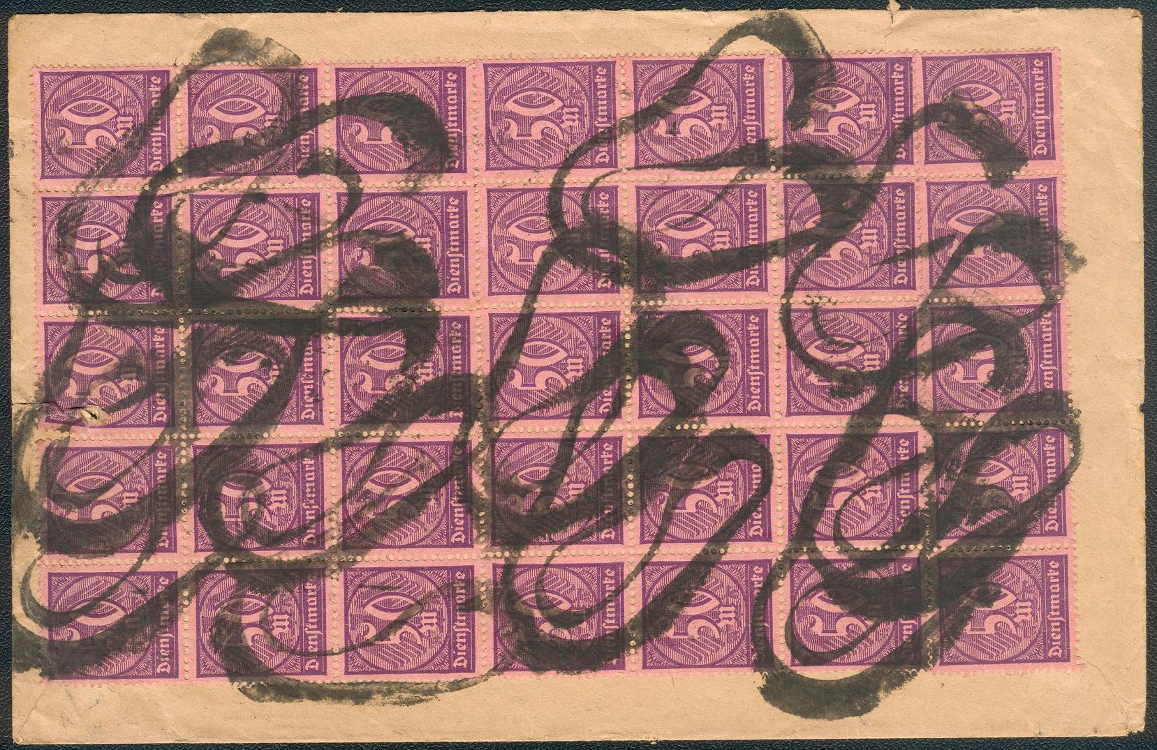 Frankiert mit 1x Mi.Nr. 253, 4x Mi.Nr. 255 (2 als senkrechtes Paar), einem waagerechten Paar Dienstmarke Nr. 74 und 36x Dienstmarke Nr. 73 ( 1x einzeln; 1x waagerechter 5er; 2x 15er Block).