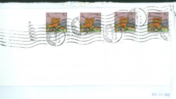 wenn das, was zu versenden war, nur in ein Riesenkuvert passte, brauchte man die Wertzeichen nicht extra auszuschneiden, sondern klebte einfach komplette Ganzsachen auf das Kuvert. So ein Riesenkuvert macht nur beim Scannen Probs.