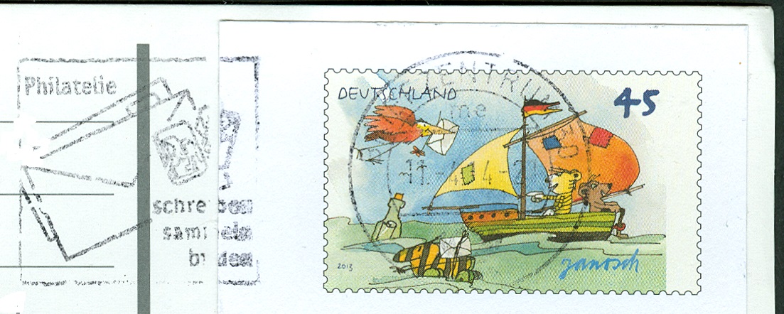 eine Ganzsache des Ausgabejahres 2014 soll nicht unterschlagen werden. Die Tierkinder-60er. Auf der Igel-Einzelmarke verlieren sich die in Weiß gehaltenen Markenanteile an den seitlichen Ränern, lassen die Marke kleiner erscheinen. Was bei der Ganzsache so natürlich nicht wieder gegeben werden konnte. Durch den Wertstempelrand wirkt die Markenvorlage etwas größer. Optisch gesehen.