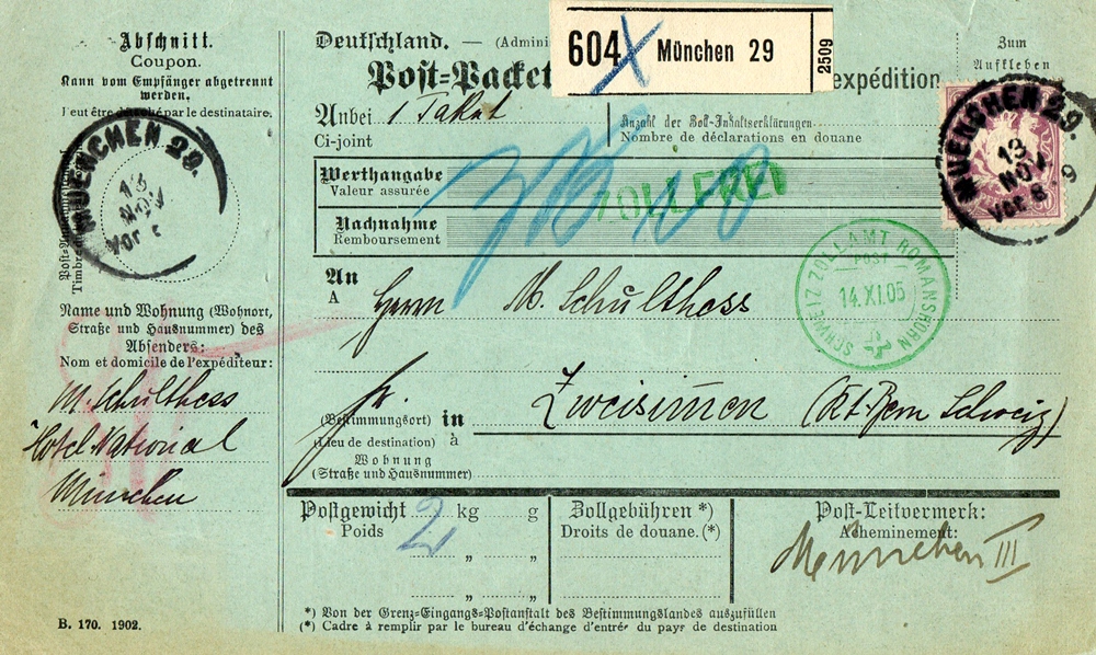 Der grüne Stempel ist vom Schweizer Zollpostamt Romanshorn.