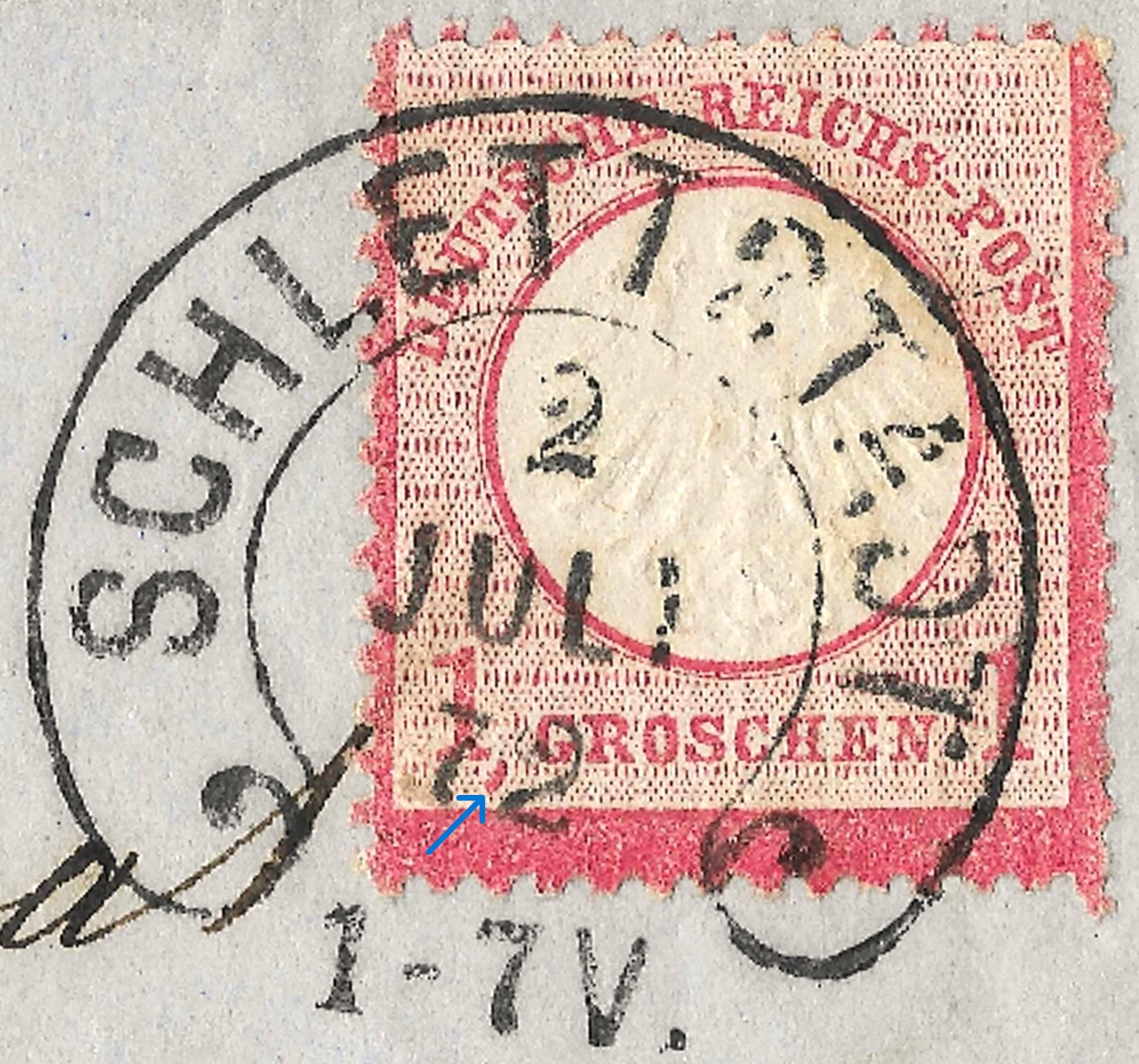 Die Marke hat den nicht häufigen PF LX Farbstrich rechts unter der linken Wertziffer (siehe Pfeil), der nur auf der DR 4 vorkommt.