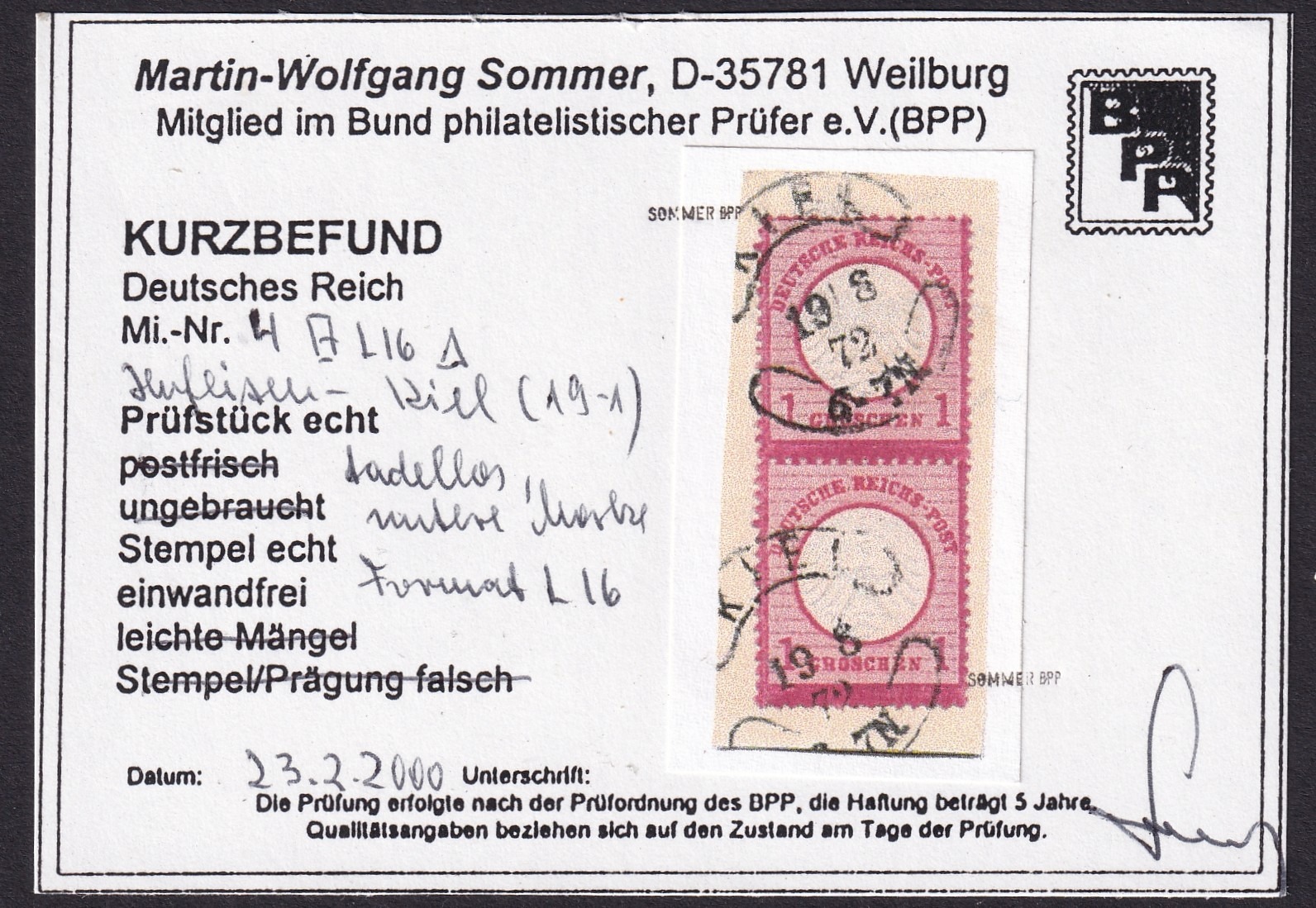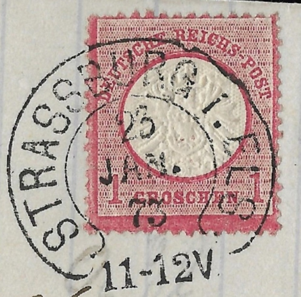 Ich kann euch einen Brief mit einem sauberen Abschlag auf einer1 Groschen Marke kl. Schild vom 2.7.72 nach Mülhausen zeigen.