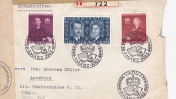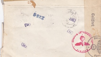 Vielleicht ist der Beleg aus Liechtenstein mit der OKW - Zensur und den vielen Zensorstempeln etwas besser. Wenn er denn portorichtig ist.
