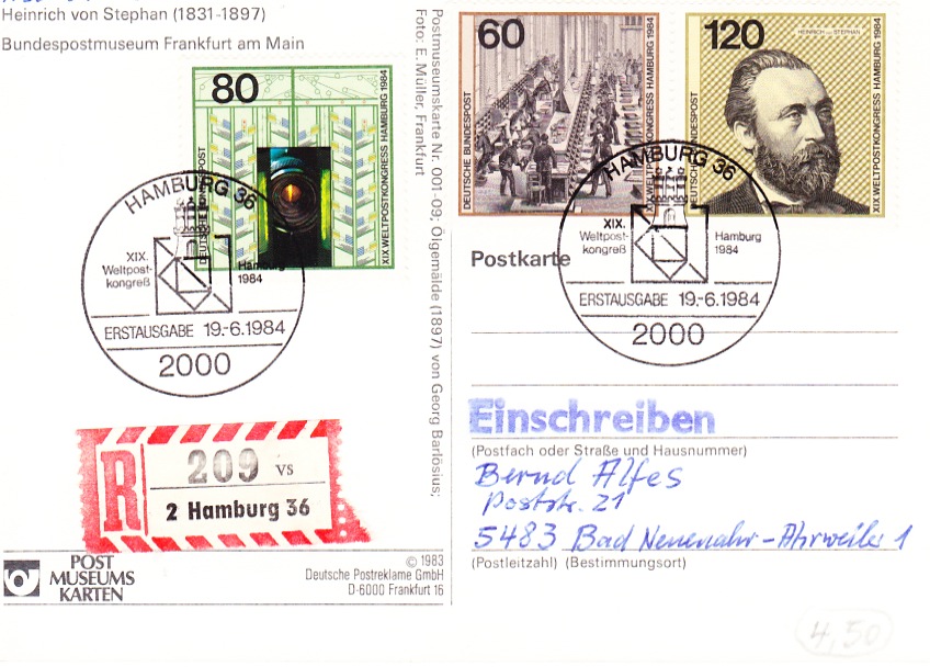 die folgenden Briefe sind zwar keine "Schmuck-"FDC, aber ich finde sie trotzdem interessant. Wegen des Sonderstempels habe ich zuerst gar nicht realisiert, dass es sich um Ersttagsbriefe handelt, erst beim Nachschlagen des Erstausgabetages. Bemerkenswert finde ich, dass es sich um den kompletten ersten Automatenmarkensatz handelt und das - soweit ich das sehe - alle Briefe portogerecht sind, 2 Einschreiben zu 2,10 DM und 4 Einschreiben eigenhändig zu 3,30 DM. Da muss man ein bisschen puzzeln, um das so hinzubekommen. Und echt gelaufen müssten sie eigentlich auch sein, sonst gäbe es doch keine Einschreiben-Aufkleber, oder?