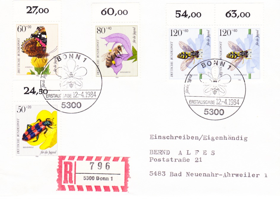die folgenden Briefe sind zwar keine "Schmuck-"FDC, aber ich finde sie trotzdem interessant. Wegen des Sonderstempels habe ich zuerst gar nicht realisiert, dass es sich um Ersttagsbriefe handelt, erst beim Nachschlagen des Erstausgabetages. Bemerkenswert finde ich, dass es sich um den kompletten ersten Automatenmarkensatz handelt und das - soweit ich das sehe - alle Briefe portogerecht sind, 2 Einschreiben zu 2,10 DM und 4 Einschreiben eigenhändig zu 3,30 DM. Da muss man ein bisschen puzzeln, um das so hinzubekommen. Und echt gelaufen müssten sie eigentlich auch sein, sonst gäbe es doch keine Einschreiben-Aufkleber, oder?