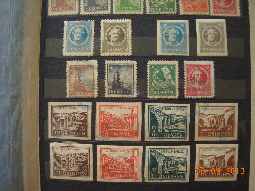Die MV - Marken stammen aus dm Satz Mi.Nr. 8 - 19 und die Thüringer aus der Serie Mi.Nr. 92 - 99.