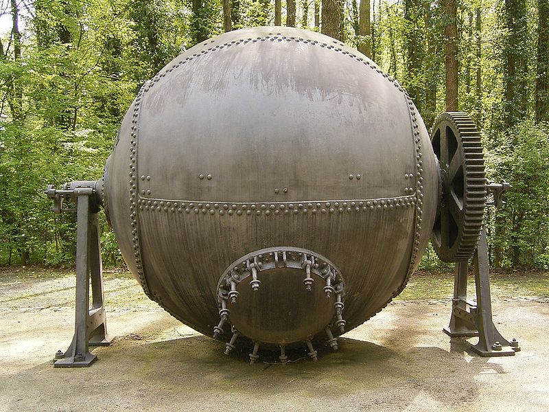 Unter dem Kugelkocher ist ein kugelförmiger Kocher von zwei bis drei Metern Durchmesser zu verstehen, der etwa 500 bis 1200 kg faßt und sich während des Kochprozesses langsam dreht, während gleichzeitig durch die in der Achse befindlichen Rohrleitungen Dampf und Lauge zugeführt werden. Nach Beendigung des Kochens wird die Lauge abgelassen und das Kochgut mit heißem Wasser durchgespült; es verläßt dann durch die im Bild ersichtliche Öffnung -das Mannloch- den Kocher."