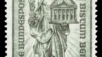 Ein Modell der Kathedrale in der Hand ihrer Patronin, der Hl. Hedwig, auf Mi 133 (Berlin) aus dem Jahre 1955: 25 Jahre Bistum Berlin; Wiederaufbau zerstörter Kirchen.