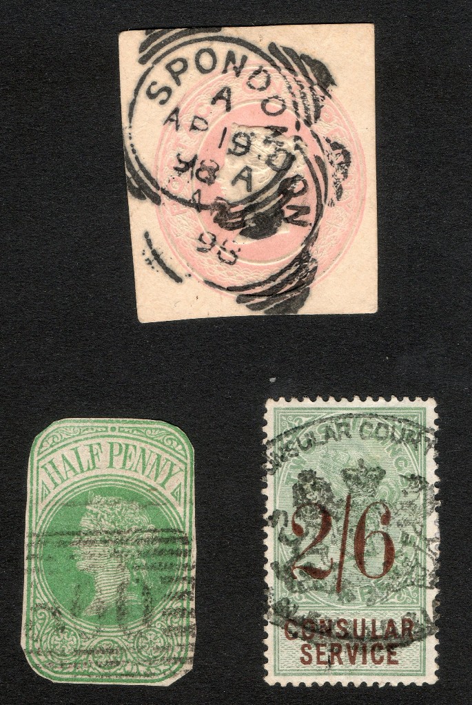 Diese Marken wurden in britischen Konsulaten in der ganzen Welt benützt. Unten in der Stempel soll die Stadt bezeichnet werden, wenn Sie sie entziffern können.