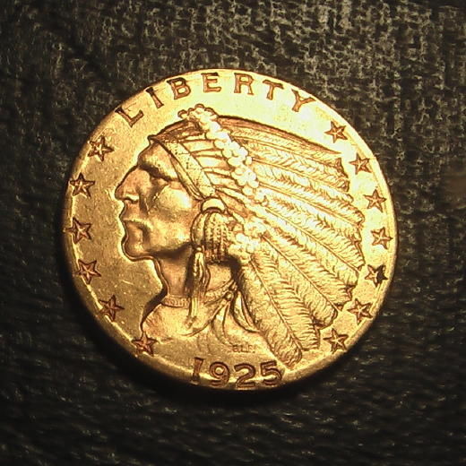 das Stück sieht entfernt einer 2,50-$-US-Goldmünze ähnlich, Indianerkopf und Adler sind aber hier viel grober dargestellt, der Landesname und das Liberty fehlen, die Umrandung ist anders, das Stück wird wohl nicht aus Gold sein, oder? Leider ist die Abbildung sehr schattig, heißt die Jahreszahl unten 1925? Steht unter dem Adler noch ein Nennwert?