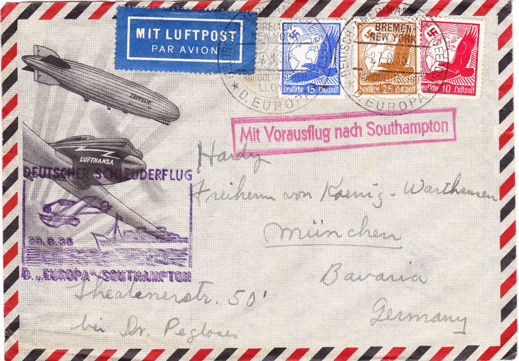 Der Beleg ist schon besser, m.E. echter Schleuderflugbeleg aus 1935. Die Erhaltung ist nicht optimal, zappeliger Bestätigungsstempel und kleiner Stockfleck rechts unter dem Luftpostzettel. Trotzdem sehe ich den bei 10 - 15 EUR netto.
