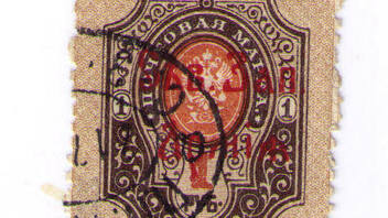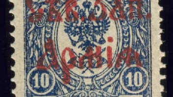 Nr. 4 (?) 10K dunkelblau mit Aufdruck aber in rot (die anderen haben Aufdruck schwarz) gezähnt und gestempelt.