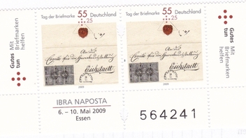 01.04.: Am 7. Mai 2009 erscheint wieder eine Zuschlagsmarke zum "Tag der Brief-marke". Auf ihr ist der legendäre "Eichstätt-Brief" illustriert, der vom 6. bis 10. Mai auf der IBRA/NAPOSTA/19. Internationalen Briefmarken-Messe in Essen im Original bewundert werden kann. Deshalb nimmt die Randgestaltung auch auf dieses Ereignis Bezug. Sammler haben zwei Besonderheiten zu beachten: eine neue Sicherheitsstanzung und eine Nummerierung der Zehnerbogen. Die Sicherheitsstanzung hat die Form eines Eichenblattes und ist so angebracht, dass sie in der linken oder rechten Perforation einer Marke deutlich zu sehen ist. Mit dieser neuen Stanzung testet die Deutsche Post erstmals ein Ausstattungsmerkmal, das einen noch höheren Schutz gegen Fälschungen zum Schaden der Post bieten soll, obwohl es aktuell offenbar dafür keinen Anlass gibt. Allerdings kamen in der jüngeren Vergangenheit einige "gelungene" Fälschungen von deutschen Dauer- und Sondermarken in Umlauf, so dass es klug ist, sich zu wappnen. Die zweite Neuerung bei dieser Ausgabe ist die Nummerierung auf dem rechten unteren Bogenrand. Wer mehrere Zehnerbogen der Zuschlagsmarke zum "Tag der Briefmarke" 2009 erwirbt, sollte sich allerdings nicht wundern, wenn die Nummerierung nicht fortlaufend ist. So wird sie zwar auf die Bogen aufgedruckt, aber die Konfektionierung für den Verkauf über die Schalter und die Niederlassung Philatelie erfolgt aus 20 verschiedenen Stapeln, so dass bestenfalls einzelne Nummernkreise in einer zu 20 Bogen abgepackten Tasche erkennbar sein werden. Darüber hinaus werden Nummern in Umlauf kommen, die, wenn man sie mit 10 multipliziert, eine Auflage ergeben, die der späteren Verkaufszahl wohl nicht entsprechen wird. Von den Zuschlagsmarken werden immer wesentlich mehr gedruckt als verkauft werden. Sammler sollten sich rechtzeitig überlegen, wie sie diese Ausgabe sammeln wollen. Die Sicherheitsstanzung in Form eines Eichenlaubes ist nur im Markenpaar zu erkennen; einzelne Marken sehen "angefressen" aus. Der Randeindruck "IBRA/NA-POSTA" und die Nummerierung üben einen gewissen philatelistischen Reiz aus. Allen Ansprüchen genügt ein Paar aus dem Bogenunterrand. Ob die Versandstelle in Weiden so etwas speziell anbieten wird, bleibt abzuwarten. Fachhändler werden sicherlich auf die Bedürfnisse ihrer Kunden reagieren. Im Zweifelsfall sollte man selbst die Initiative am Postschalter ergreifen. Die MICHEL-Redaktion wird übrigens eine Hauptnummer mit zwei Unternummern für die linke und rechte Sicherheitsstanzung vergeben.