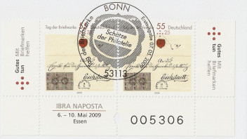 01.04.: Am 7. Mai 2009 erscheint wieder eine Zuschlagsmarke zum "Tag der Brief-marke". Auf ihr ist der legendäre "Eichstätt-Brief" illustriert, der vom 6. bis 10. Mai auf der IBRA/NAPOSTA/19. Internationalen Briefmarken-Messe in Essen im Original bewundert werden kann. Deshalb nimmt die Randgestaltung auch auf dieses Ereignis Bezug. Sammler haben zwei Besonderheiten zu beachten: eine neue Sicherheitsstanzung und eine Nummerierung der Zehnerbogen. Die Sicherheitsstanzung hat die Form eines Eichenblattes und ist so angebracht, dass sie in der linken oder rechten Perforation einer Marke deutlich zu sehen ist. Mit dieser neuen Stanzung testet die Deutsche Post erstmals ein Ausstattungsmerkmal, das einen noch höheren Schutz gegen Fälschungen zum Schaden der Post bieten soll, obwohl es aktuell offenbar dafür keinen Anlass gibt. Allerdings kamen in der jüngeren Vergangenheit einige "gelungene" Fälschungen von deutschen Dauer- und Sondermarken in Umlauf, so dass es klug ist, sich zu wappnen. Die zweite Neuerung bei dieser Ausgabe ist die Nummerierung auf dem rechten unteren Bogenrand. Wer mehrere Zehnerbogen der Zuschlagsmarke zum "Tag der Briefmarke" 2009 erwirbt, sollte sich allerdings nicht wundern, wenn die Nummerierung nicht fortlaufend ist. So wird sie zwar auf die Bogen aufgedruckt, aber die Konfektionierung für den Verkauf über die Schalter und die Niederlassung Philatelie erfolgt aus 20 verschiedenen Stapeln, so dass bestenfalls einzelne Nummernkreise in einer zu 20 Bogen abgepackten Tasche erkennbar sein werden. Darüber hinaus werden Nummern in Umlauf kommen, die, wenn man sie mit 10 multipliziert, eine Auflage ergeben, die der späteren Verkaufszahl wohl nicht entsprechen wird. Von den Zuschlagsmarken werden immer wesentlich mehr gedruckt als verkauft werden. Sammler sollten sich rechtzeitig überlegen, wie sie diese Ausgabe sammeln wollen. Die Sicherheitsstanzung in Form eines Eichenlaubes ist nur im Markenpaar zu erkennen; einzelne Marken sehen "angefressen" aus. Der Randeindruck "IBRA/NA-POSTA" und die Nummerierung üben einen gewissen philatelistischen Reiz aus. Allen Ansprüchen genügt ein Paar aus dem Bogenunterrand. Ob die Versandstelle in Weiden so etwas speziell anbieten wird, bleibt abzuwarten. Fachhändler werden sicherlich auf die Bedürfnisse ihrer Kunden reagieren. Im Zweifelsfall sollte man selbst die Initiative am Postschalter ergreifen. Die MICHEL-Redaktion wird übrigens eine Hauptnummer mit zwei Unternummern für die linke und rechte Sicherheitsstanzung vergeben.