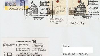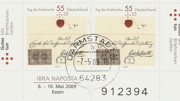 01.04.: Am 7. Mai 2009 erscheint wieder eine Zuschlagsmarke zum "Tag der Brief-marke". Auf ihr ist der legendäre "Eichstätt-Brief" illustriert, der vom 6. bis 10. Mai auf der IBRA/NAPOSTA/19. Internationalen Briefmarken-Messe in Essen im Original bewundert werden kann. Deshalb nimmt die Randgestaltung auch auf dieses Ereignis Bezug. Sammler haben zwei Besonderheiten zu beachten: eine neue Sicherheitsstanzung und eine Nummerierung der Zehnerbogen. Die Sicherheitsstanzung hat die Form eines Eichenblattes und ist so angebracht, dass sie in der linken oder rechten Perforation einer Marke deutlich zu sehen ist. Mit dieser neuen Stanzung testet die Deutsche Post erstmals ein Ausstattungsmerkmal, das einen noch höheren Schutz gegen Fälschungen zum Schaden der Post bieten soll, obwohl es aktuell offenbar dafür keinen Anlass gibt. Allerdings kamen in der jüngeren Vergangenheit einige "gelungene" Fälschungen von deutschen Dauer- und Sondermarken in Umlauf, so dass es klug ist, sich zu wappnen. Die zweite Neuerung bei dieser Ausgabe ist die Nummerierung auf dem rechten unteren Bogenrand. Wer mehrere Zehnerbogen der Zuschlagsmarke zum "Tag der Briefmarke" 2009 erwirbt, sollte sich allerdings nicht wundern, wenn die Nummerierung nicht fortlaufend ist. So wird sie zwar auf die Bogen aufgedruckt, aber die Konfektionierung für den Verkauf über die Schalter und die Niederlassung Philatelie erfolgt aus 20 verschiedenen Stapeln, so dass bestenfalls einzelne Nummernkreise in einer zu 20 Bogen abgepackten Tasche erkennbar sein werden. Darüber hinaus werden Nummern in Umlauf kommen, die, wenn man sie mit 10 multipliziert, eine Auflage ergeben, die der späteren Verkaufszahl wohl nicht entsprechen wird. Von den Zuschlagsmarken werden immer wesentlich mehr gedruckt als verkauft werden. Sammler sollten sich rechtzeitig überlegen, wie sie diese Ausgabe sammeln wollen. Die Sicherheitsstanzung in Form eines Eichenlaubes ist nur im Markenpaar zu erkennen; einzelne Marken sehen "angefressen" aus. Der Randeindruck "IBRA/NA-POSTA" und die Nummerierung üben einen gewissen philatelistischen Reiz aus. Allen Ansprüchen genügt ein Paar aus dem Bogenunterrand. Ob die Versandstelle in Weiden so etwas speziell anbieten wird, bleibt abzuwarten. Fachhändler werden sicherlich auf die Bedürfnisse ihrer Kunden reagieren. Im Zweifelsfall sollte man selbst die Initiative am Postschalter ergreifen. Die MICHEL-Redaktion wird übrigens eine Hauptnummer mit zwei Unternummern für die linke und rechte Sicherheitsstanzung vergeben.
