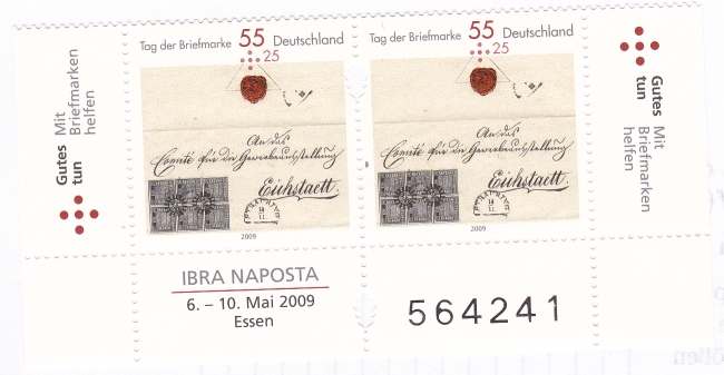 01.04.: Am 7. Mai 2009 erscheint wieder eine Zuschlagsmarke zum "Tag der Brief-marke". Auf ihr ist der legendäre "Eichstätt-Brief" illustriert, der vom 6. bis 10. Mai auf der IBRA/NAPOSTA/19. Internationalen Briefmarken-Messe in Essen im Original bewundert werden kann. Deshalb nimmt die Randgestaltung auch auf dieses Ereignis Bezug. Sammler haben zwei Besonderheiten zu beachten: eine neue Sicherheitsstanzung und eine Nummerierung der Zehnerbogen. Die Sicherheitsstanzung hat die Form eines Eichenblattes und ist so angebracht, dass sie in der linken oder rechten Perforation einer Marke deutlich zu sehen ist. Mit dieser neuen Stanzung testet die Deutsche Post erstmals ein Ausstattungsmerkmal, das einen noch höheren Schutz gegen Fälschungen zum Schaden der Post bieten soll, obwohl es aktuell offenbar dafür keinen Anlass gibt. Allerdings kamen in der jüngeren Vergangenheit einige "gelungene" Fälschungen von deutschen Dauer- und Sondermarken in Umlauf, so dass es klug ist, sich zu wappnen. Die zweite Neuerung bei dieser Ausgabe ist die Nummerierung auf dem rechten unteren Bogenrand. Wer mehrere Zehnerbogen der Zuschlagsmarke zum "Tag der Briefmarke" 2009 erwirbt, sollte sich allerdings nicht wundern, wenn die Nummerierung nicht fortlaufend ist. So wird sie zwar auf die Bogen aufgedruckt, aber die Konfektionierung für den Verkauf über die Schalter und die Niederlassung Philatelie erfolgt aus 20 verschiedenen Stapeln, so dass bestenfalls einzelne Nummernkreise in einer zu 20 Bogen abgepackten Tasche erkennbar sein werden. Darüber hinaus werden Nummern in Umlauf kommen, die, wenn man sie mit 10 multipliziert, eine Auflage ergeben, die der späteren Verkaufszahl wohl nicht entsprechen wird. Von den Zuschlagsmarken werden immer wesentlich mehr gedruckt als verkauft werden. Sammler sollten sich rechtzeitig überlegen, wie sie diese Ausgabe sammeln wollen. Die Sicherheitsstanzung in Form eines Eichenlaubes ist nur im Markenpaar zu erkennen; einzelne Marken sehen "angefressen" aus. Der Randeindruck "IBRA/NA-POSTA" und die Nummerierung üben einen gewissen philatelistischen Reiz aus. Allen Ansprüchen genügt ein Paar aus dem Bogenunterrand. Ob die Versandstelle in Weiden so etwas speziell anbieten wird, bleibt abzuwarten. Fachhändler werden sicherlich auf die Bedürfnisse ihrer Kunden reagieren. Im Zweifelsfall sollte man selbst die Initiative am Postschalter ergreifen. Die MICHEL-Redaktion wird übrigens eine Hauptnummer mit zwei Unternummern für die linke und rechte Sicherheitsstanzung vergeben.