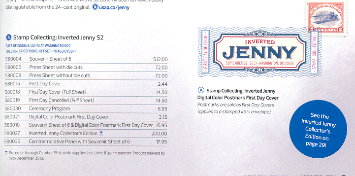 Die USA haben mal wieder eine Überraschung für die Sammler parat. Von dem berühmten Kopf stehenden Fehldruck „Inverted Jenny“ aus dem Jahre 1918 gibt es seit dem September 2013 einen Nachdruck mit geändertem Nennwert (2,- $ statt seinerzeit 24 Cent). Die Marke wurde in einem Sechserblock zusammengefasst, der von der Post nur komplett verkauft wurde. Obwohl von einem schönen Rand umfasst, wird dieser Kleinbogen nach den für Michel eigenen Kriterien nicht als Block, sondern als Folienbogen katalogisiert, die Marken sind selbstklebend und gestanzt (Michel-Nr. 5000 I BA).